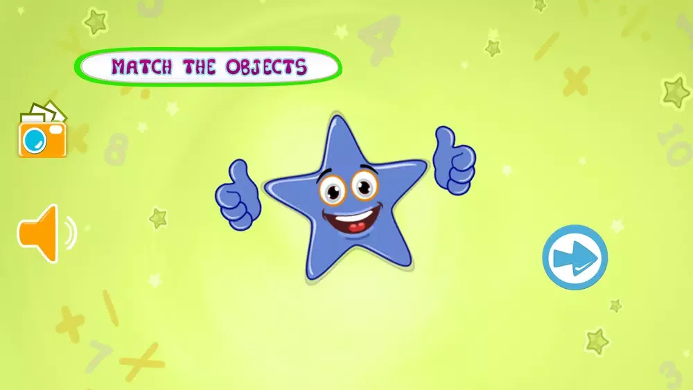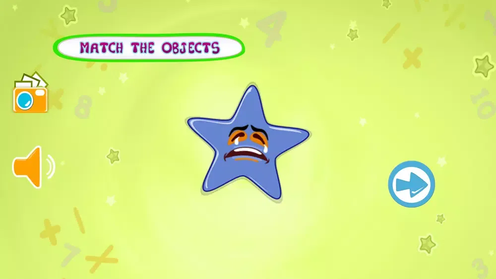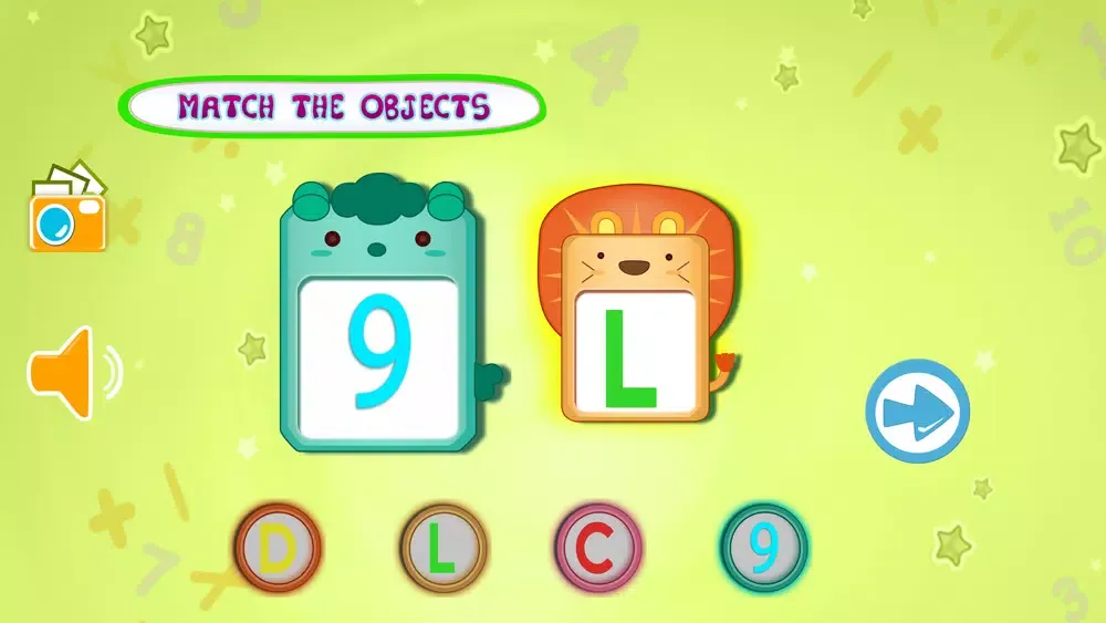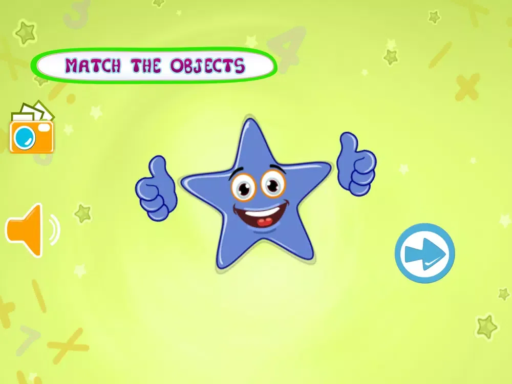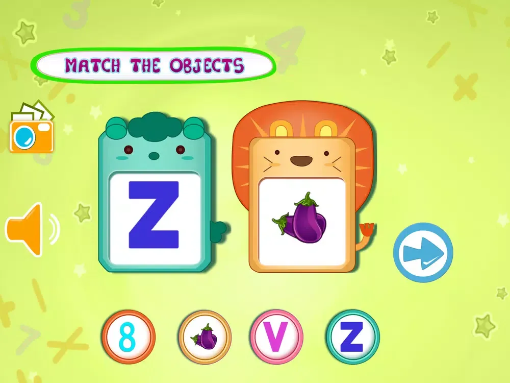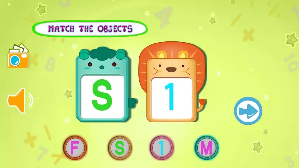 In Kids Learning- Object Matching there are two big object shown in the middle of the screen , that can be alphabet , number or an image of an object from an epic books and 6 round circle contains 6 different object .