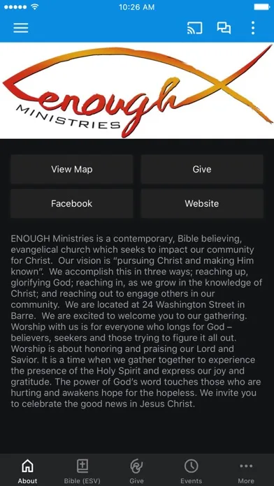 This app is for the members of ENOUGH Ministries, Barre, Vermont. This app is the central resource for all information regarding the ministry. With this app you can get information about the purpose, mission and vision of the church. You can receive information about the church such as upcoming events, past sermons, and church meeting minutes. You can also view the church calendar and recieve important push notifications from the church. The ability to life stream sermons if you are out of town or otherwise can't attend church on Sunday. The app provides the opportunity to contribute tithes and offering to this ministry. It also contains the ESV Bible which is used as the primary Bible for instruction.
