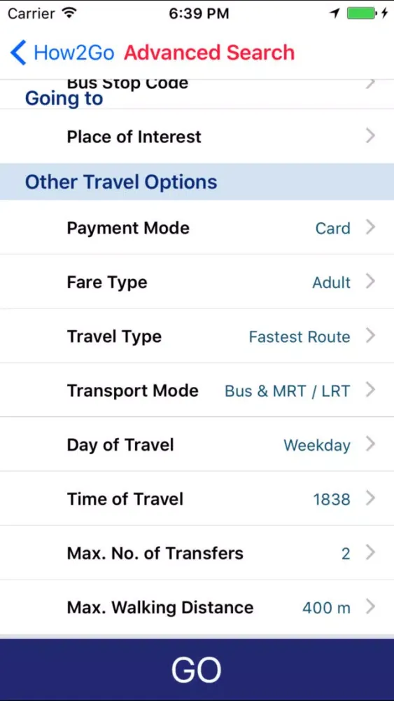 -'Advanced Search' option allows users to customise their routes by selecting their preferred transport mode, payment, travel option, day and time of travel as well as specifying the fare type, maximum number of transfers, maximum walking distance, etc.