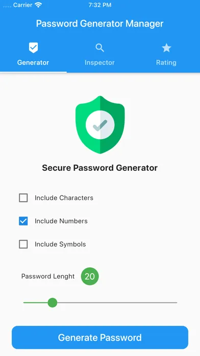 With Password Generator Manager you will be able to generate secure passwords under demand for example you can choose the length if you want to include numbers, symbols, characters or all at one. Generating for you ultra secure pass.