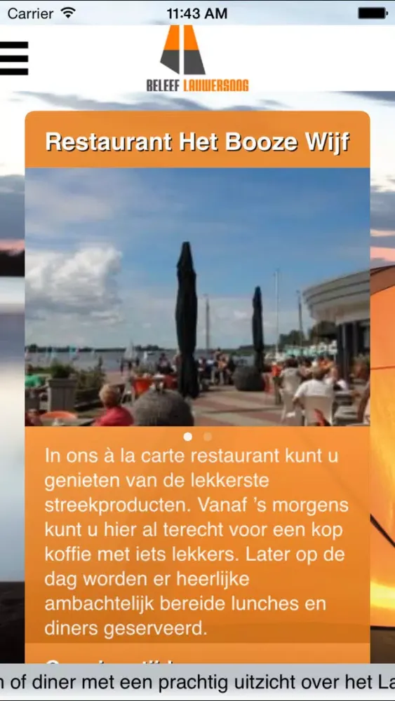 Met de Lauwersoog App heeft u voor aankomst en tijdens uw verblijf op Lauwersoog, gelegen in het prachtige Nationaal Park Lauwersmeer, de meest actuele informatie bij de hand over Restaurant Het Booze Wijf en Lauwersoog Water Events. De App geeft informatie over de openingstijden van alle faciliteiten, speciale aanbiedingen, het animatieprogramma en andere wetenswaardigheden die u niet mag missen aan de rand van Werelderfgoed Waddenzee.