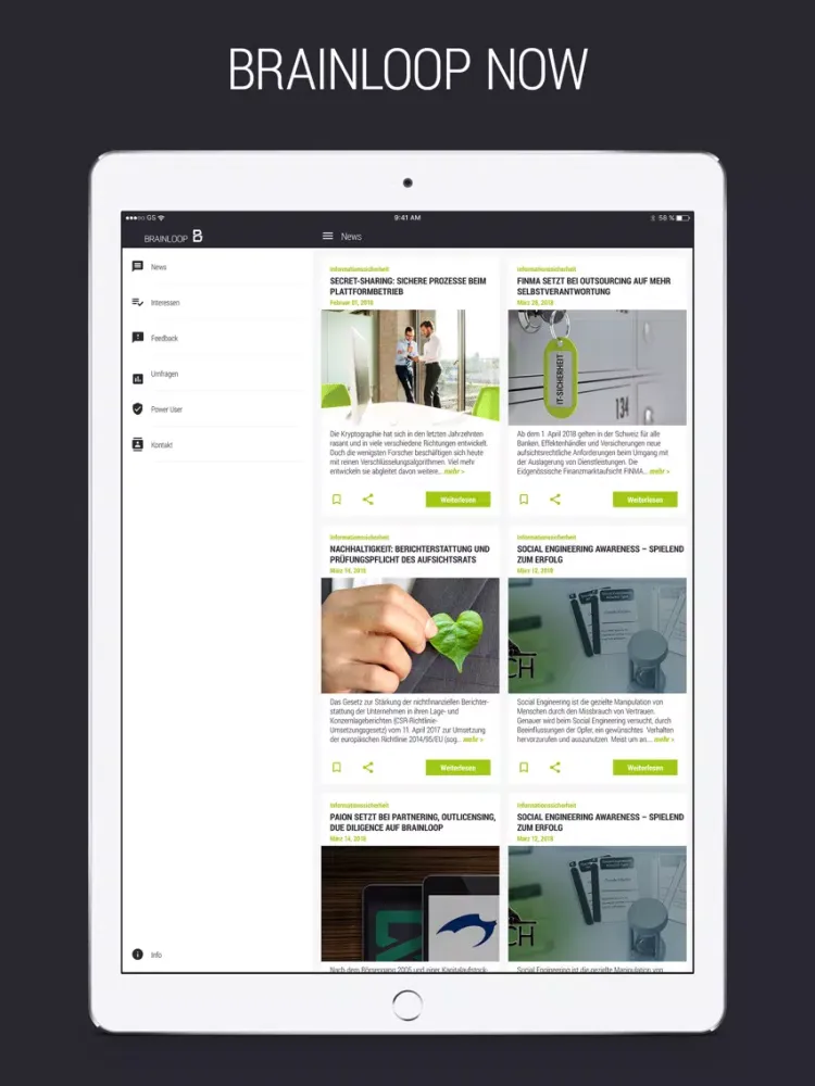 Mit Brainloop NOW haben Sie exklusiven Zugang zu Services und Informationen rund um die Brainloop Plattform. Sie profitieren von einem massgeschneiderten Angebot in der App: