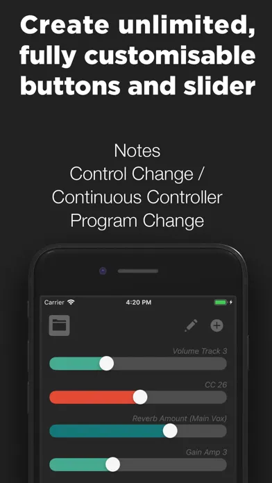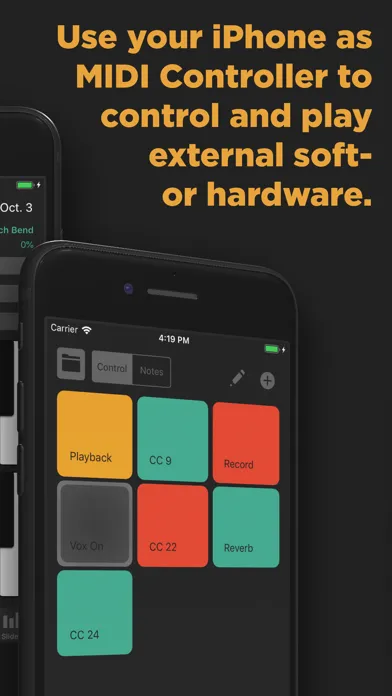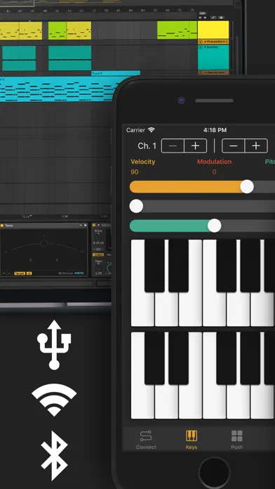 MidiController turns your iPhone/iPad into a complete MIDI controller, that works over USB, WLAN or Bluetooth. No additional software needed!