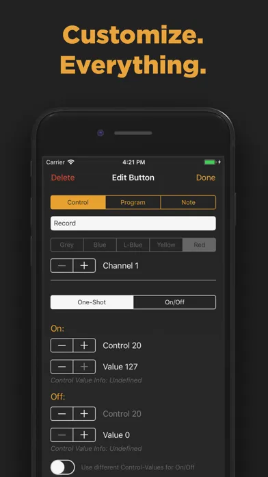 All Pushes/Buttons and Sliders are completely customisable - customize every value of every control possible and how the control behaves. You can even create dynamic controls (e.g. Program Change values that count up or down).