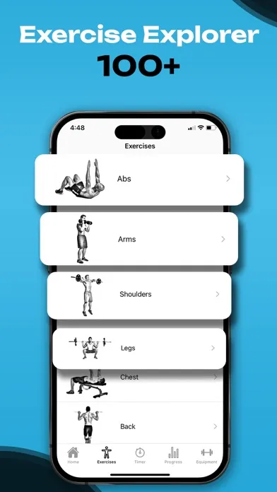Explore a library of over 100 exercises integrated into beginner, intermediate, and advanced workout plans, as well as available for custom routines.