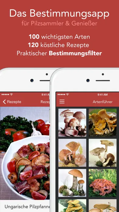 Wir präsentieren Ihnen die wichtigsten essbaren Arten mit ihren gefährlichen Doppelgängern und geben einen Überblick über klassische Speisen, die sich daraus zubereiten lassen. Mit dieser App wird Ihnen jeder Pilzausflug einen kulinarischen Genuss bescheren.