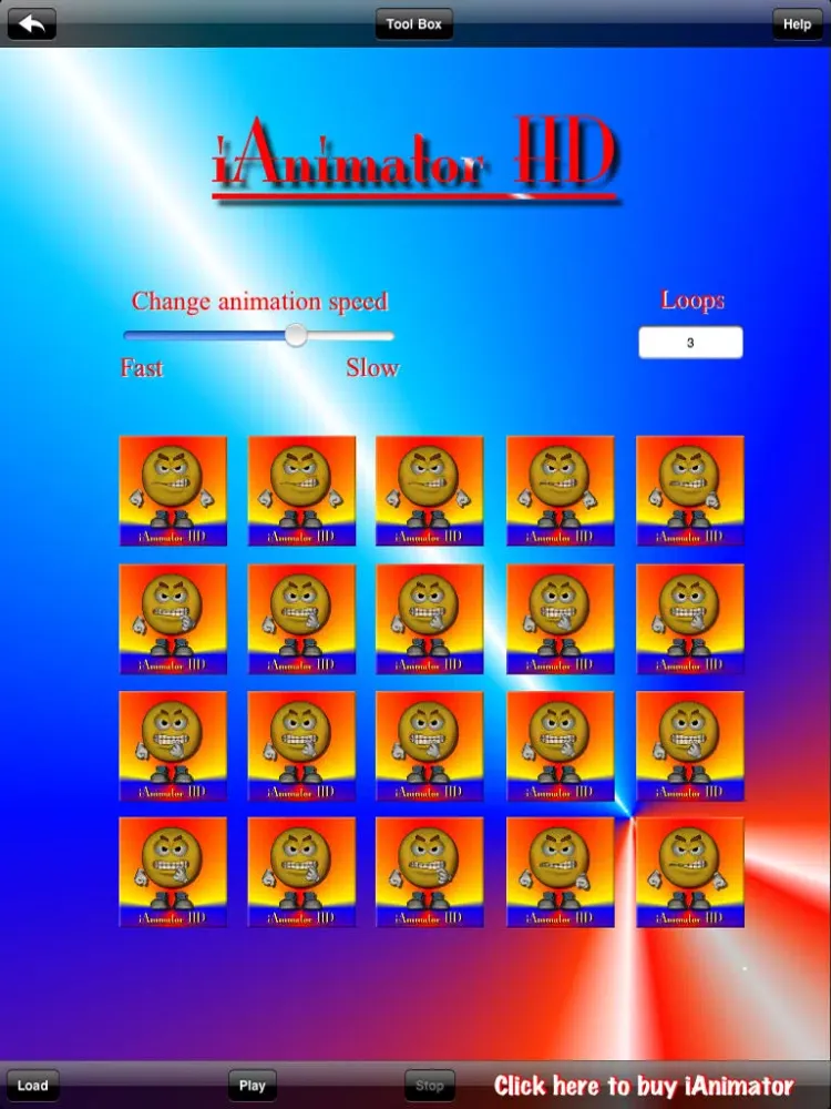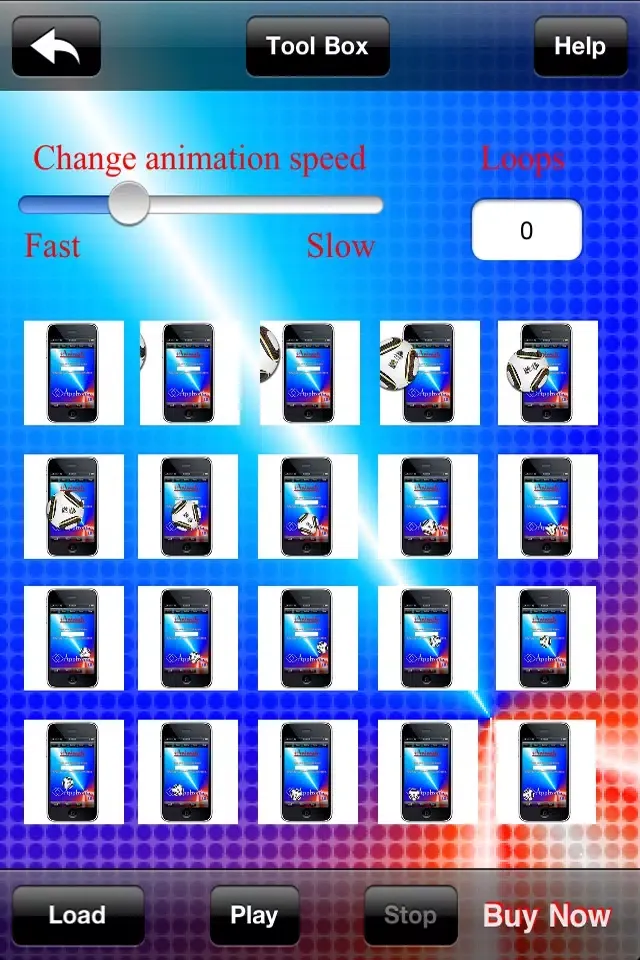 iAnimator Lite allows you to create your own animations based on photos you have taken on the iphone camera or photos/images you have loaded onto your iphone, itouch or ipad from itunes. Amaze and amuse your friends and family by selecting up to twenty images to create an animation. Take multiple photos in sequence then load them into the iAnimator Lite in the order you require. You can them adjust the speed and frequency of the animation with the slider bar and the loop counter. You also have the ability to copy and paste images. Once you have setup your animation you can select play to view your animation. Have fun.