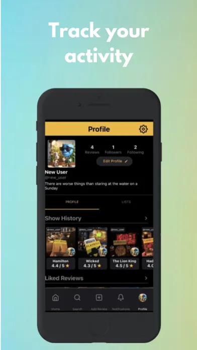 * Log shows with date, star-rating, written review, and/or photo