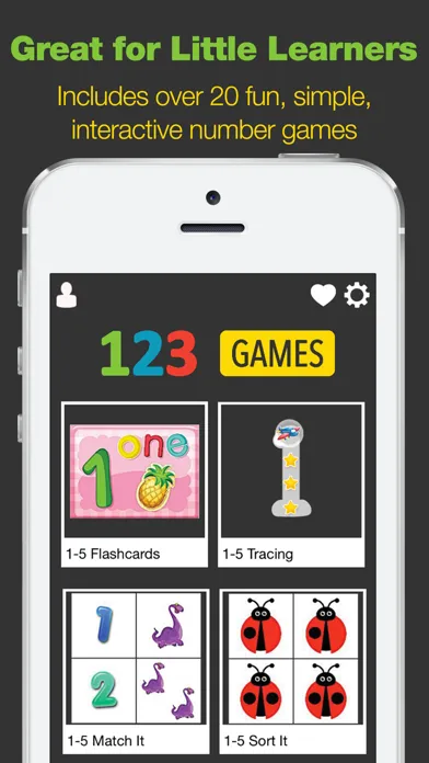 123 First Numbers Games includes over 20 learning activities and games. Activities include number and numeral recognition, finding, tracing, sorting, and sequencing games.