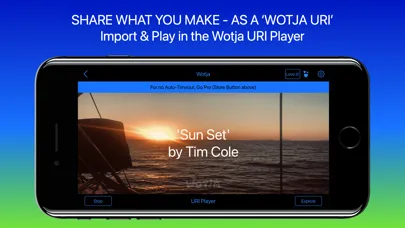 • 'URI Player' to play, imported from clipboard, a shared Wotja URI (WJURI); supports API commands for use by 3rd Party Apps & Games.