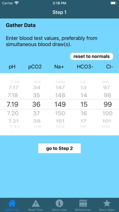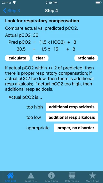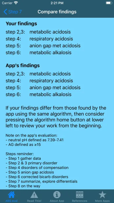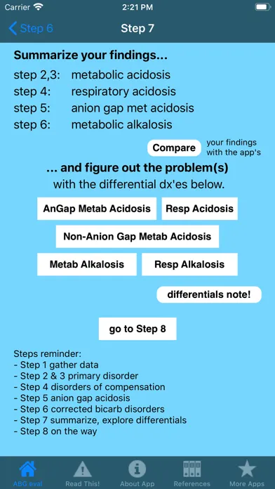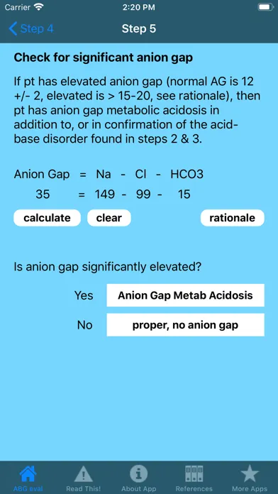 ABG Acid-Base eval walks a clinician through a stepwise approach to analyse ABG's and electrolytes in order to arrive at acid-base disorders and diagnostic ideas about ill patients. It is based mainly upon a worksheet developed by Dr. Erik Rupard from the medical literature. This tool not only yields answers, but just as importantly teaches the stepwise thinking process and the necessary concepts along the way. A clinician or learner will wind up with good information that assists patient care and should wind up a little smarter and more able to do it with less assistance the next time. It is a great support for those of us clinicians who use these tests only occasionally and don't have it memorized. The differential diagnoses include the classic mnemonics like MUDPILERS, CHAMPS, CLEVER PD, and HARDUPS, with explanations and examples.