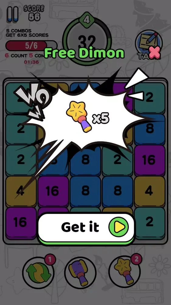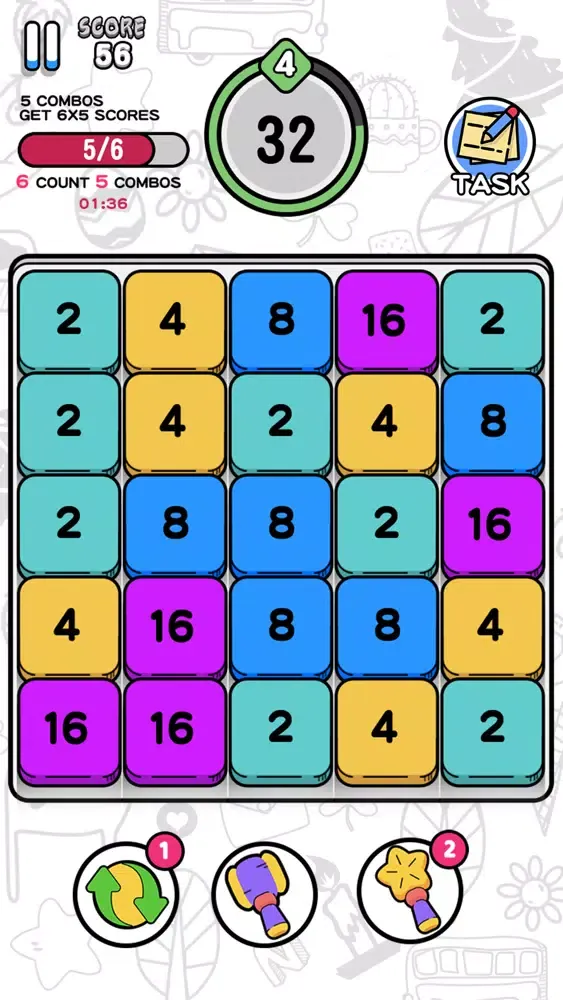 -When there are more than two adjacent squares with the same number, click on one of the squares and the adjacent blocks will be automatically combined into higher-level squares.