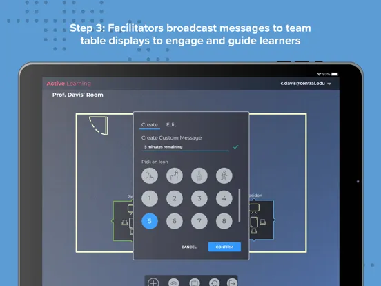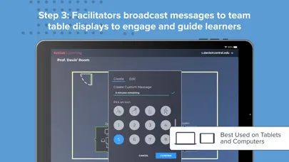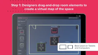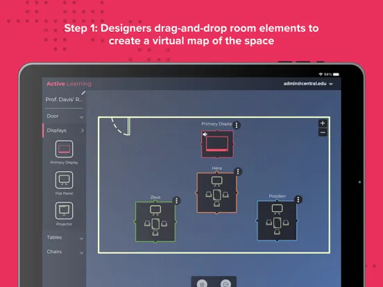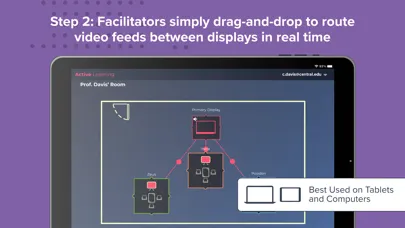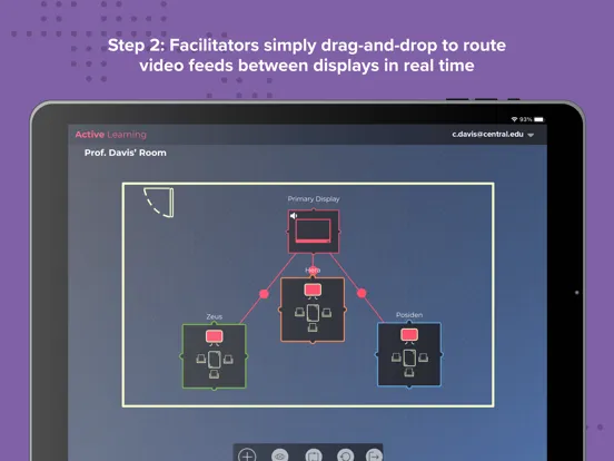 The Solstice Active Learning app features a drag-and-drop interface to allow admins and facilitators to virtually map the multi-screen environment and then easily route video and broadcast messages to team displays in real-time.