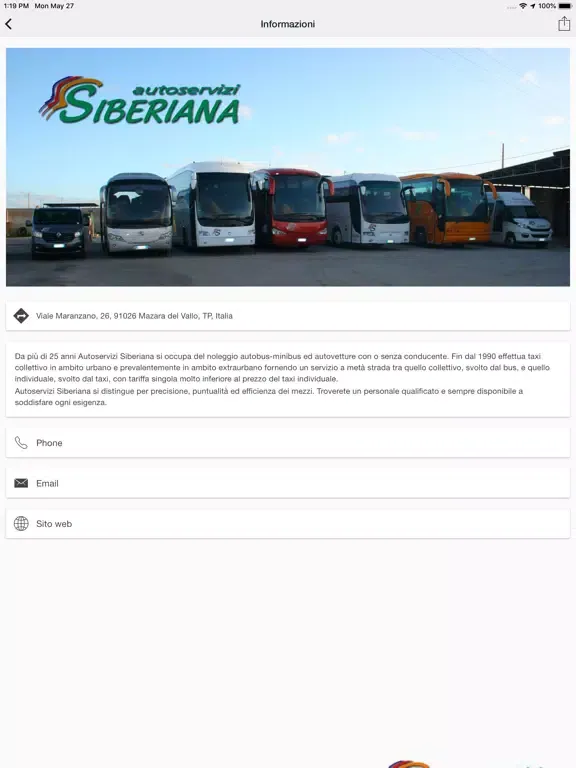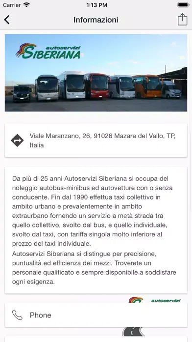 Da più di 25 anni Autoservizi Siberiana si occupa del noleggio autobus-minibus ed autovetture con o senza conducente. Fin dal 1990 effettua taxi collettivo in ambito urbano e prevalentemente in ambito extraurbano fornendo un servizio a metà strada tra quello collettivo, svolto dal bus, e quello individuale, svolto dal taxi, con tariffa singola molto inferiore al prezzo del taxi individuale.