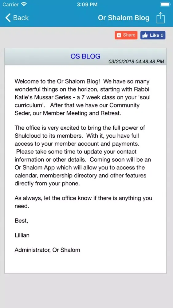 Or Shalom app keeps you up-to-date with the latest news, events, minyanim and happenings at the synagogue. It also gives you the localized zmanim for the shul's location and the users current location.