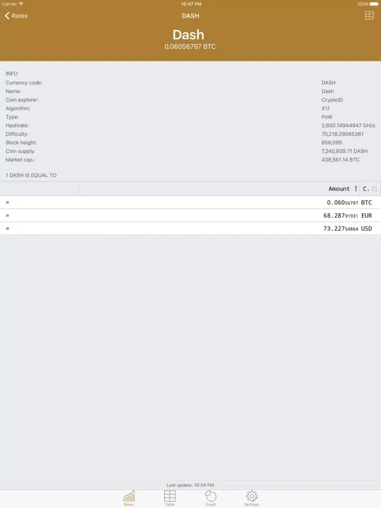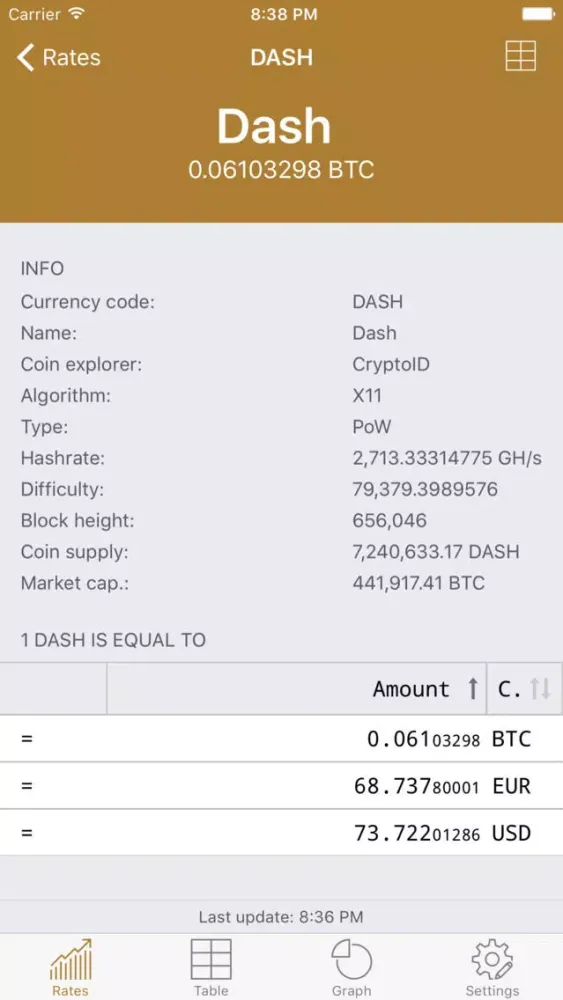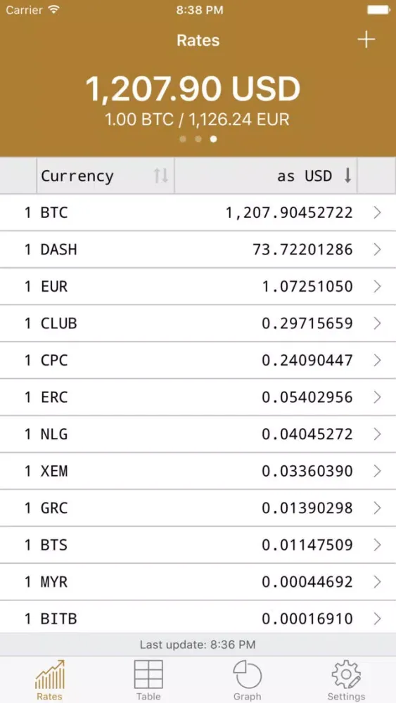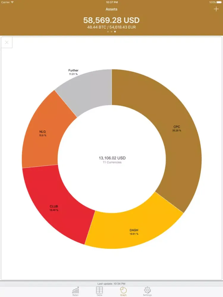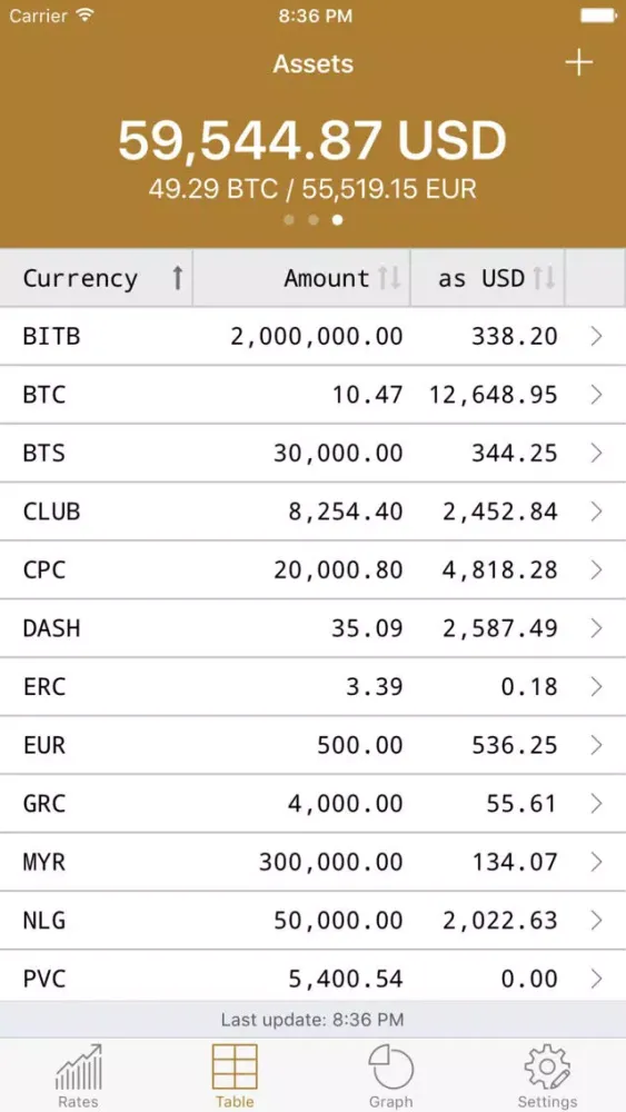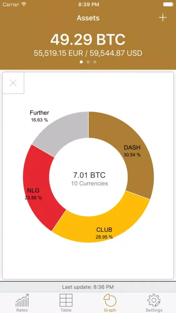 You can easily view the rates of all entered digital currencies as well as the current balances and their sum - depending on your preference within a table or a chart.