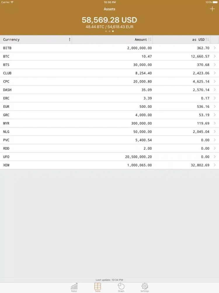 - Assets table - individually sortable overview of all entered currencies with the ability of going into detail