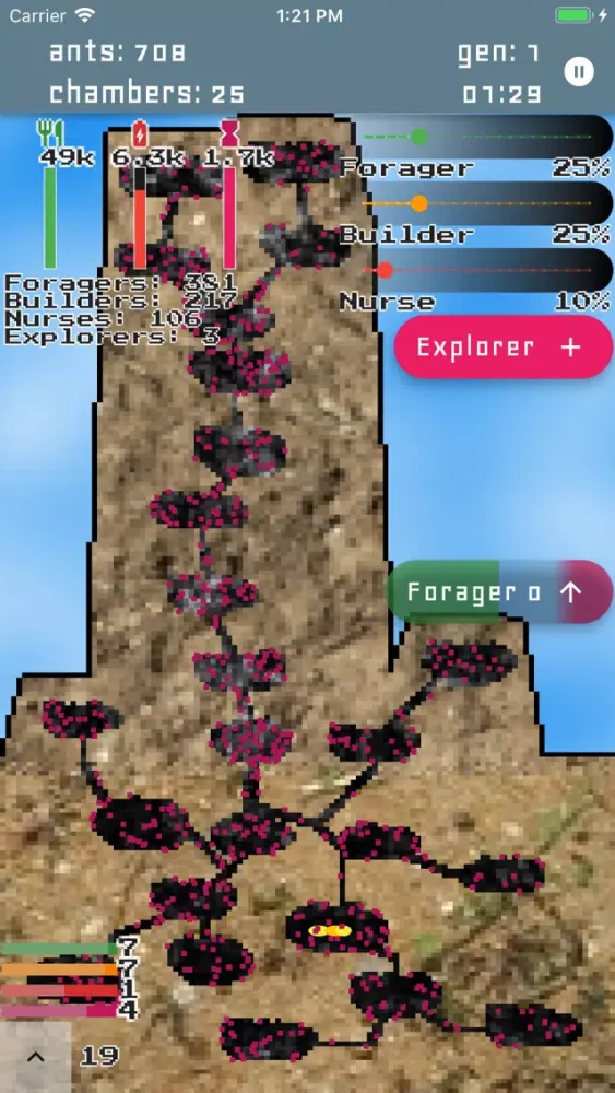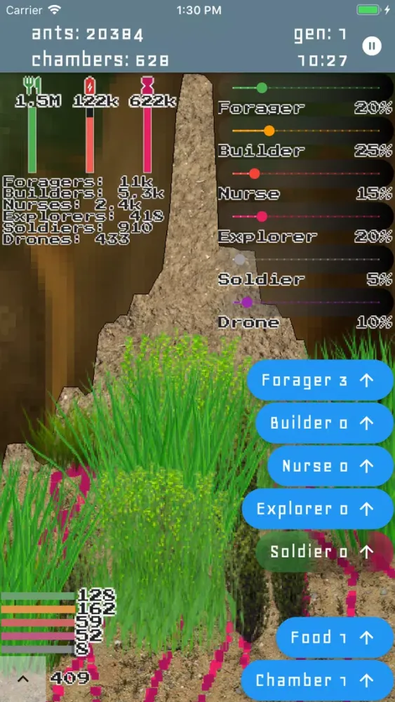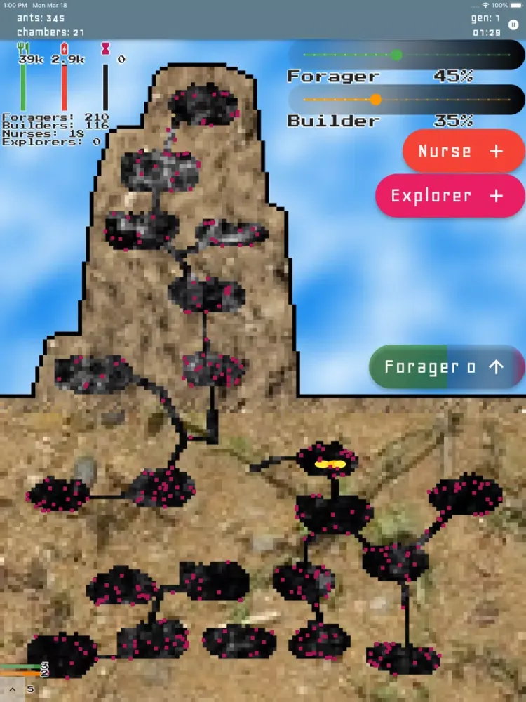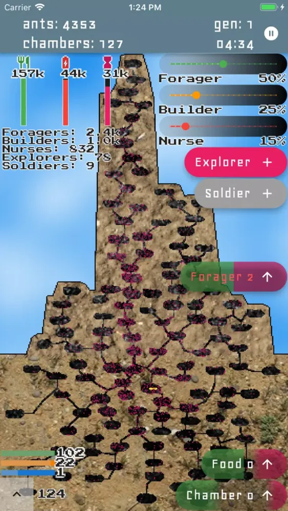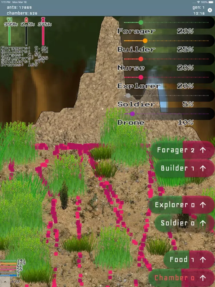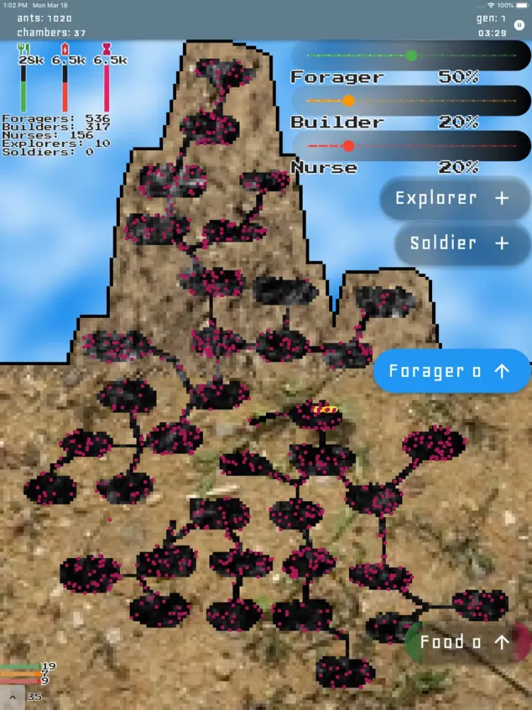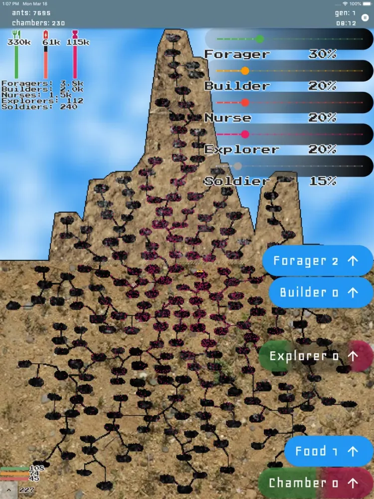As the colony grows, more options become available. There are three resources that need to be accumulated and maintained in order to grow the colony, and different ants gather different resources. Grow your colony large enough and you can unlock new options, and eventually win the level!