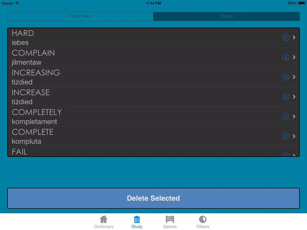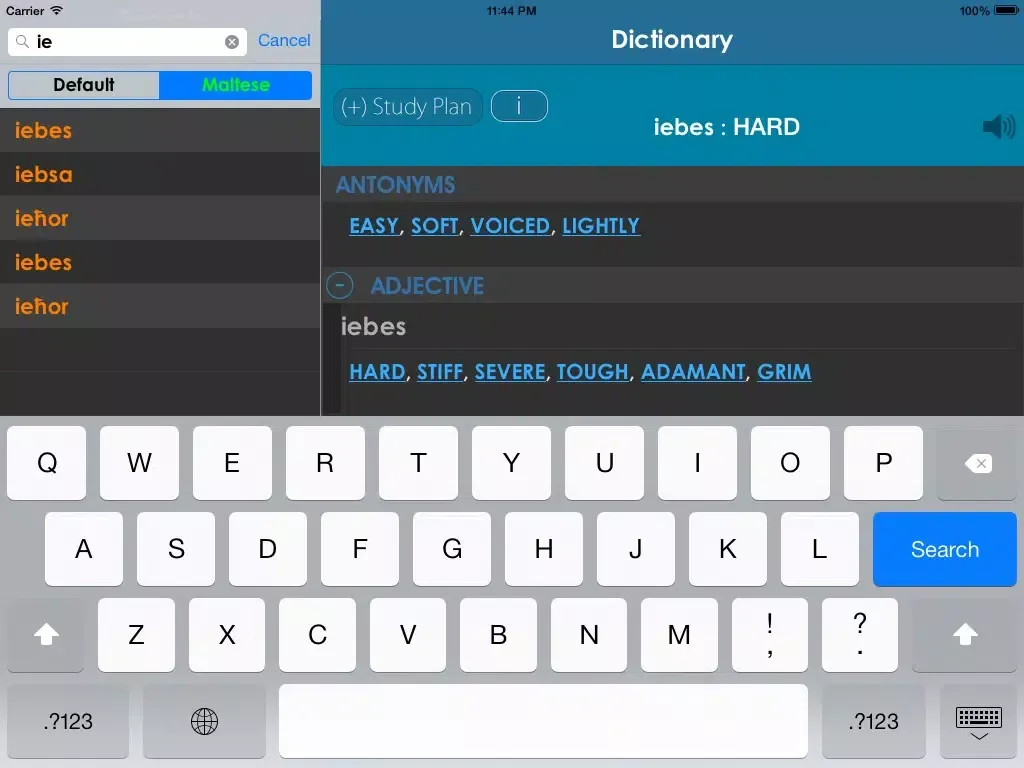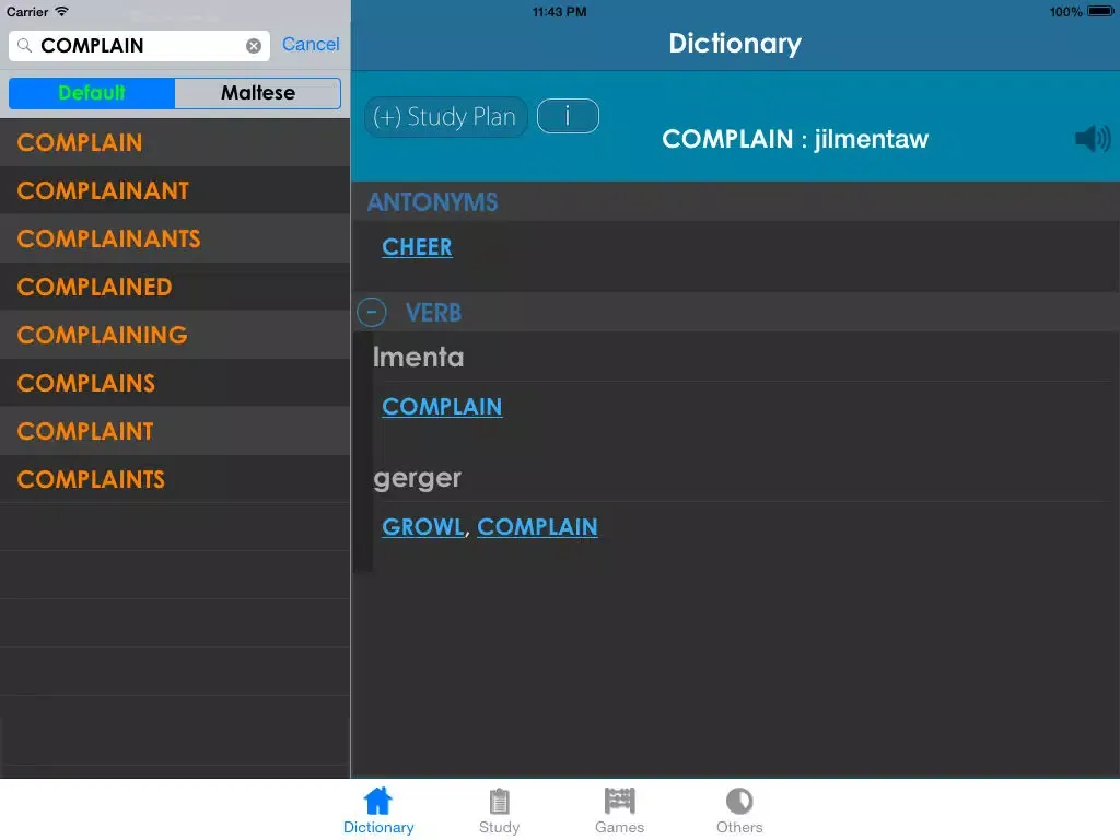 This is not only a dictionary but also a learning and translation tool. MCQ (Multiple Choice Question) option available. There is auto suggestion so you need not type full words. You can save words to study plan.
