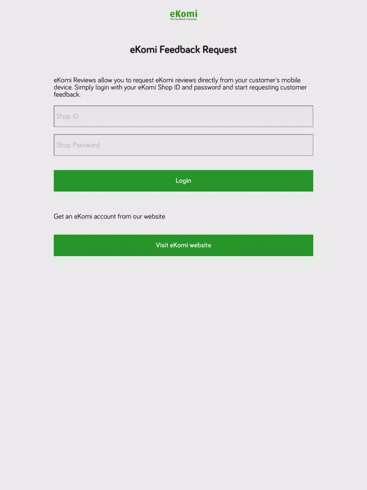 You must login to use this application. If you do not yet have an eKomi Account, or if you have one but would like us to enable this feature for you, simply contact us by phone on +44 (0)20 345 504 56, by email at info@ekomi.co.uk or visit our website at www.ekomi.co.uk for more details.