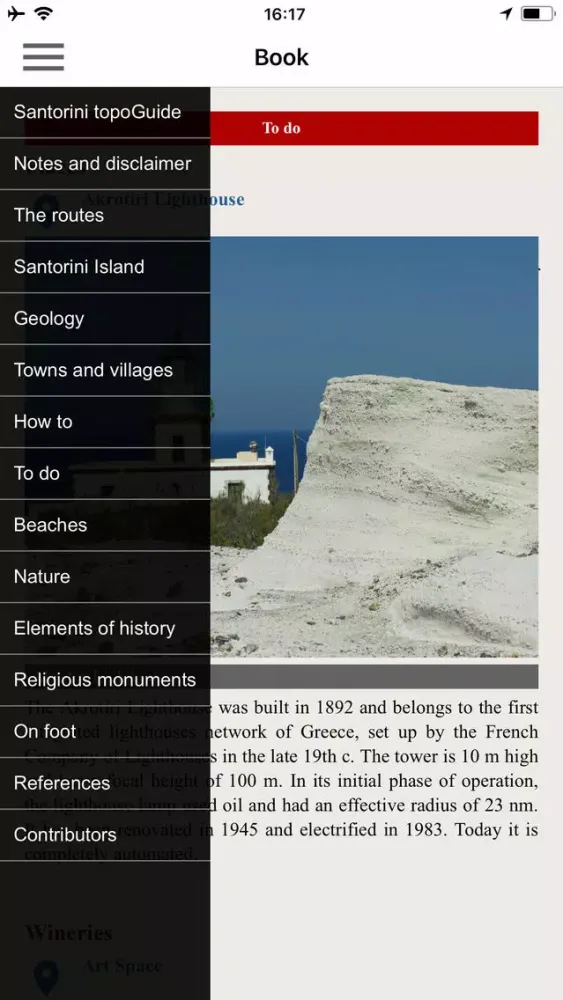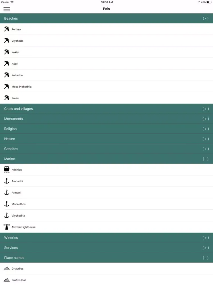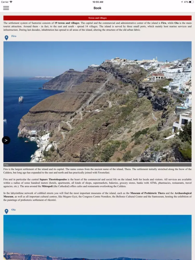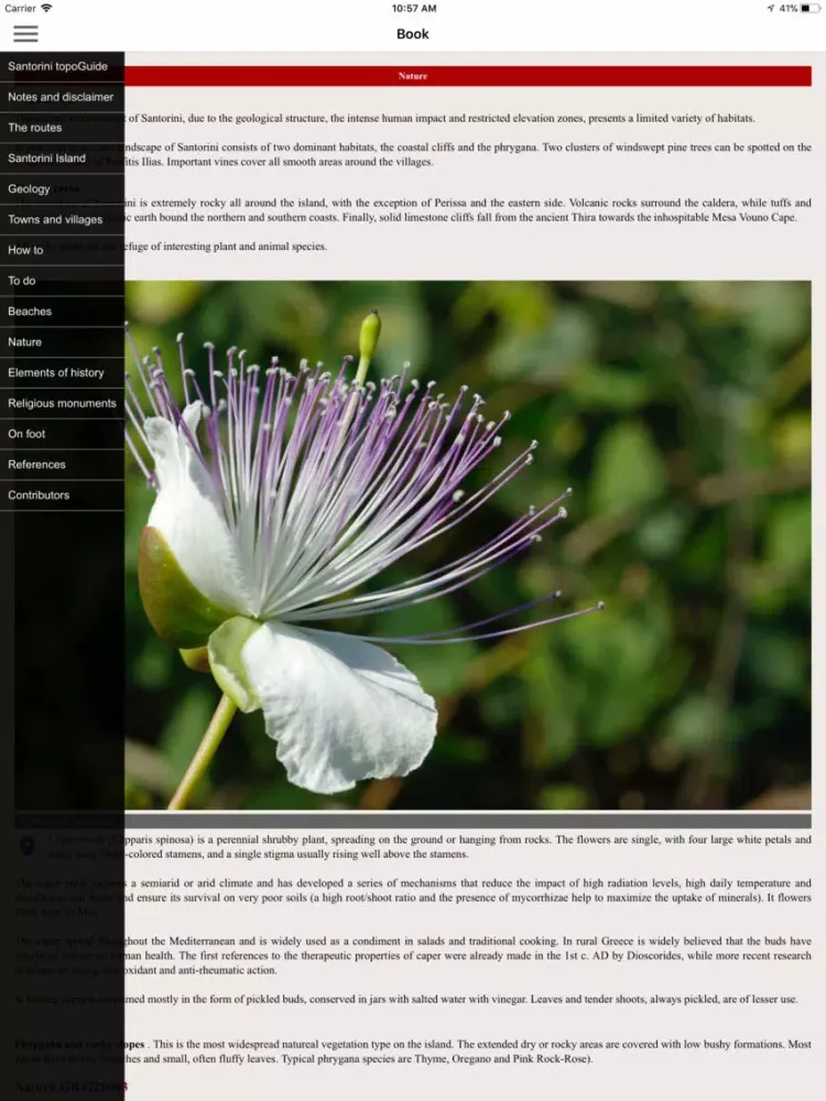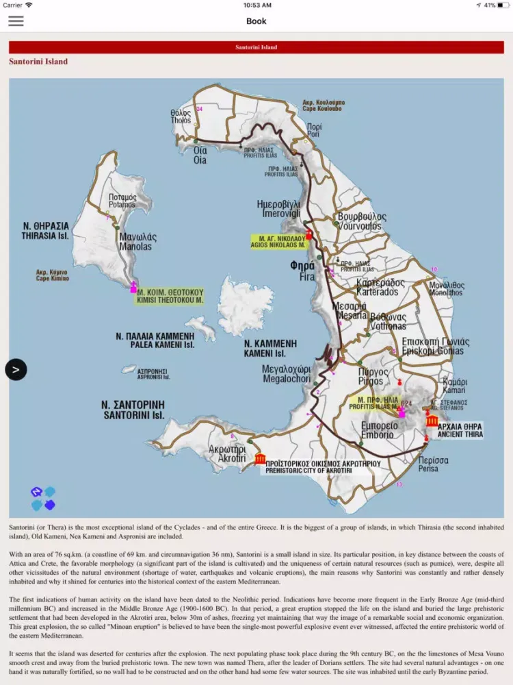 The application offers detailed offline maps and an extensive introduction on geography, geology, the most important settlements and monuments, the two famous archaeological sites, Akrotiri and Ancient Thera, and the nature of Santorini Island. The app offers also a useful list of POIs with a search feature on the map screen.
