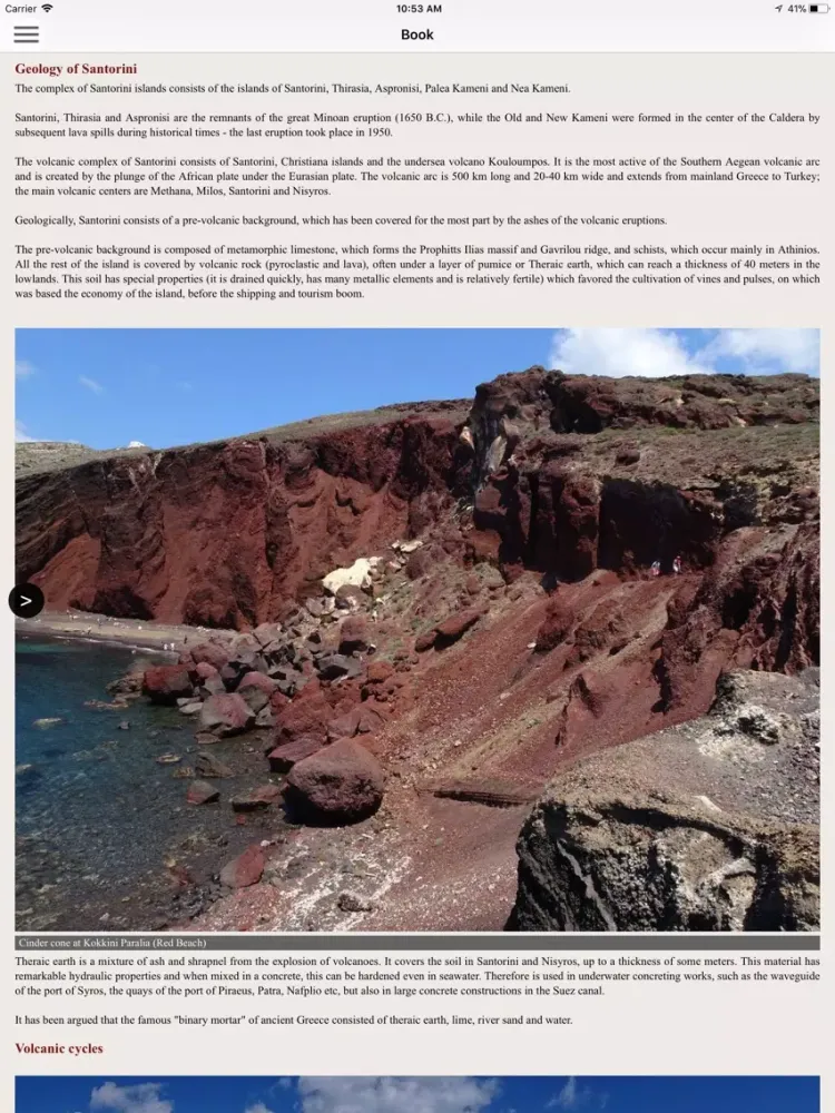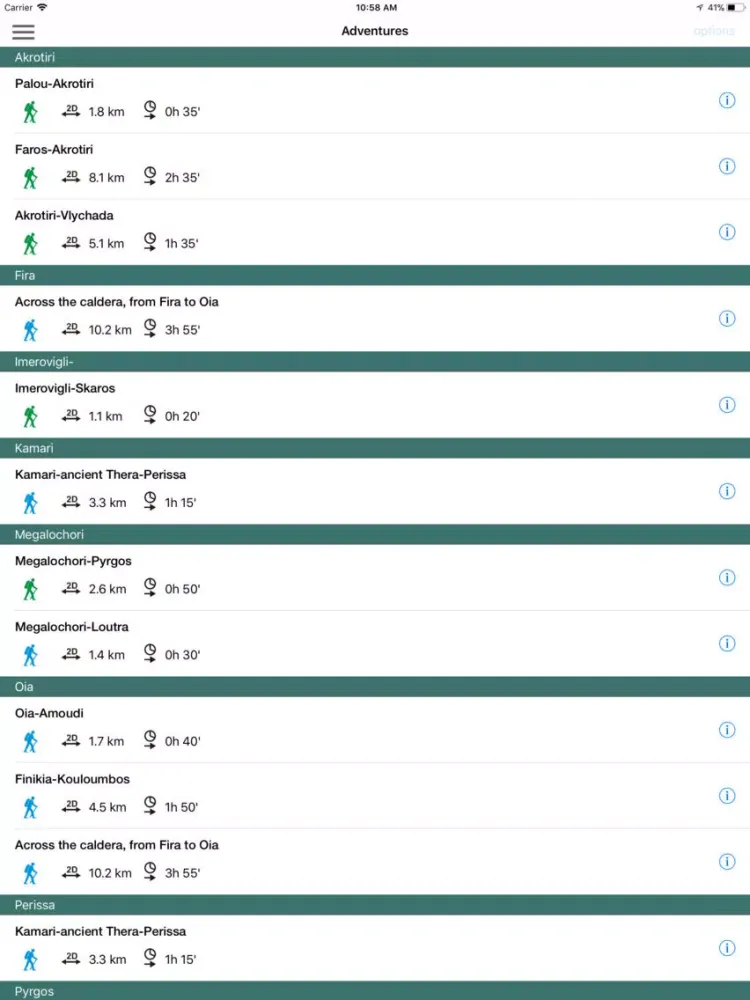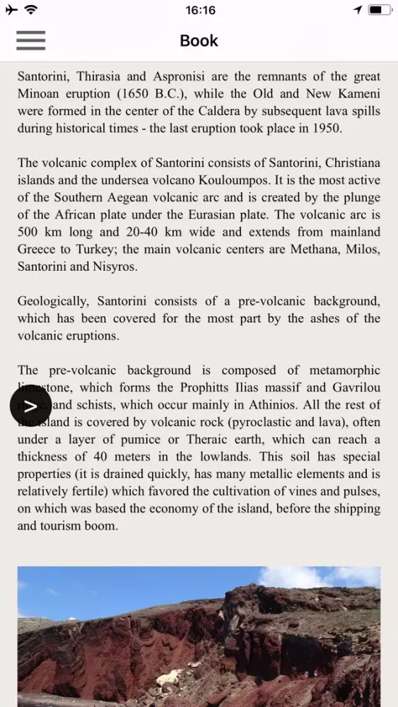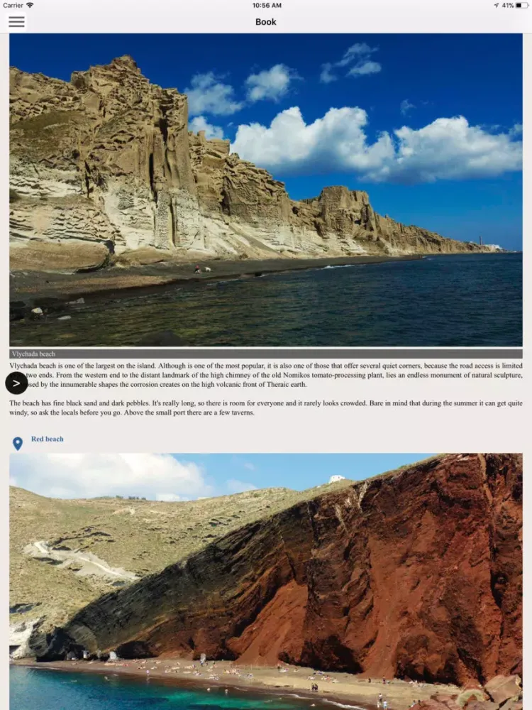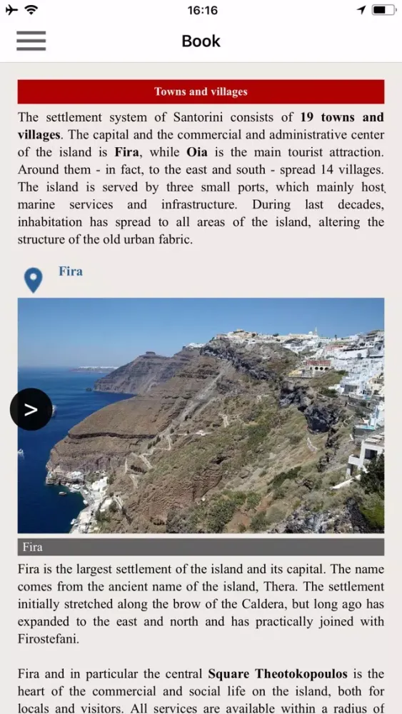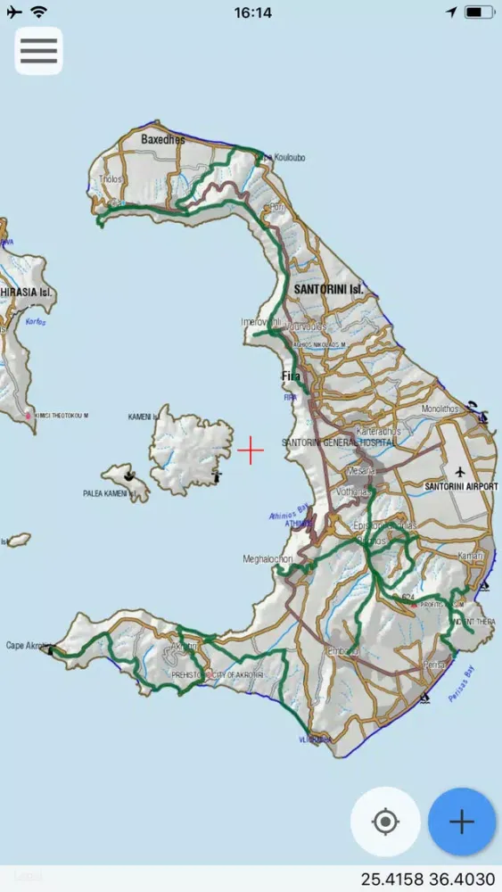 The application offers detailed offline maps and an extensive introduction on geography, geology, the most important settlements and monuments, the two famous archaeological sites, Akrotiri and Ancient Thera, and the nature of Santorini Island. The app offers also a useful list of POIs with a search feature on the map screen.