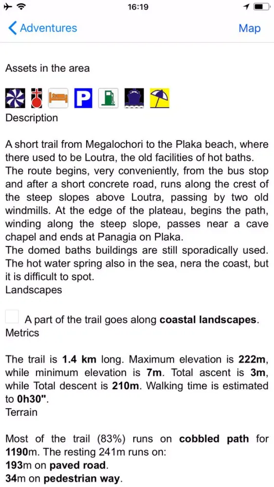 In the field, the app identifies the nearest adventure, guides you to it and then along it by displaying messages and warnings on every junction or other important location. On each Point of Interest, photos and texts are displayed on the map. If the hiker gets off-trail, the app indicates the shorter way to get back safely.