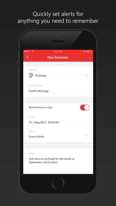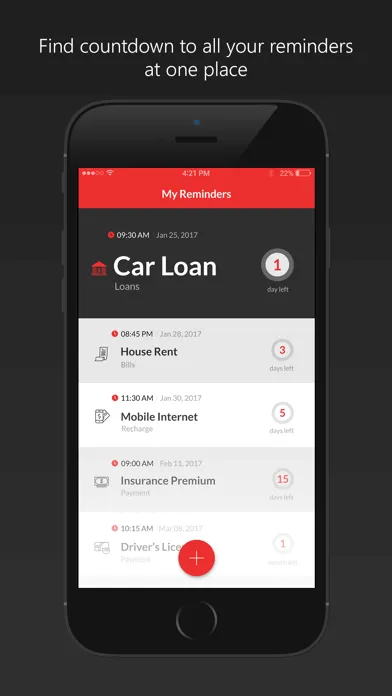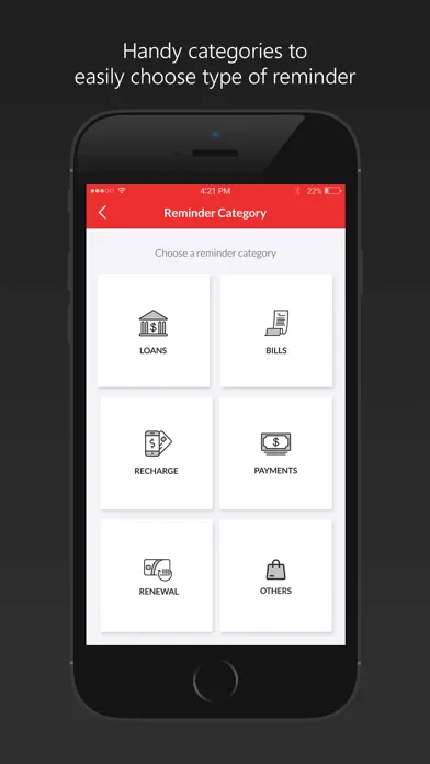 • Categories that are tailor-made for various due date types - Loans, Bills, Recharge, Payments and Renewals.