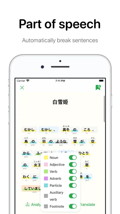 Part of speech: Use machine learning to automatically break sentences and mark the parts of speech and pronunciation of Chinese characters in sentences and paragraphs to improve your reading efficiency.