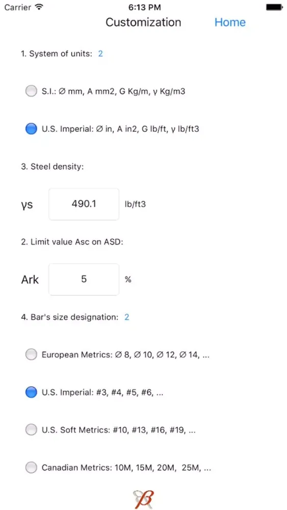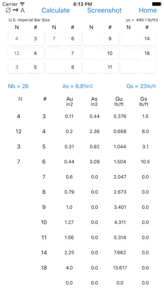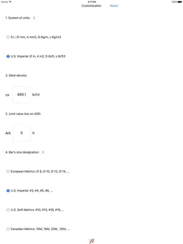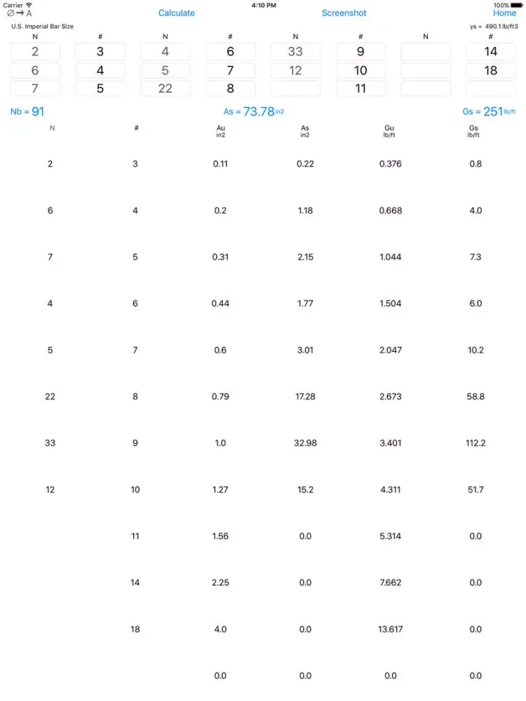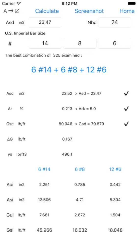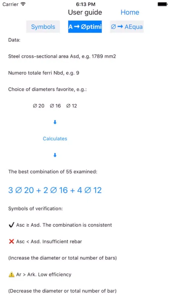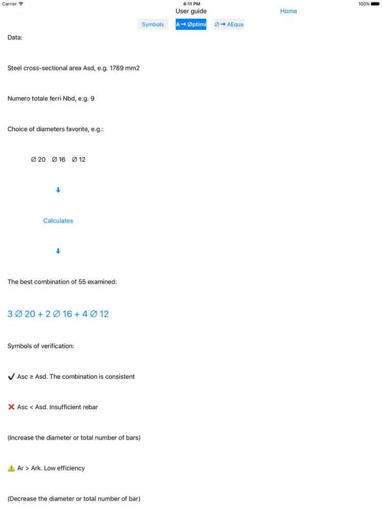 From Area to ∅ : given the value of the project area of the steel, it calculates the number of reinforcing bars in real time. The performance index "Ar" allows checking the efficiency of the combination and to avoid the waste of material.