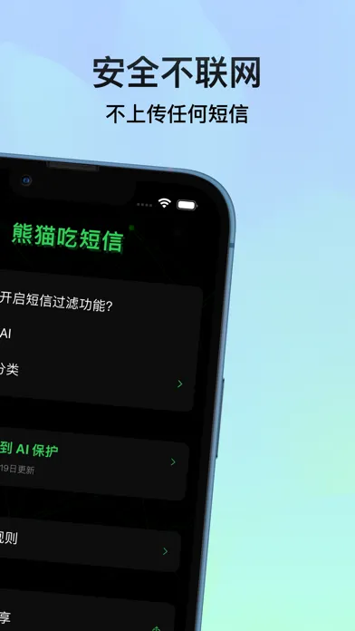 熊猫吃短信创新性的使用 CoreML 机器学习框架在手机端离线拦截垃圾短信。我们不上传用户短信,拒绝云端识别。