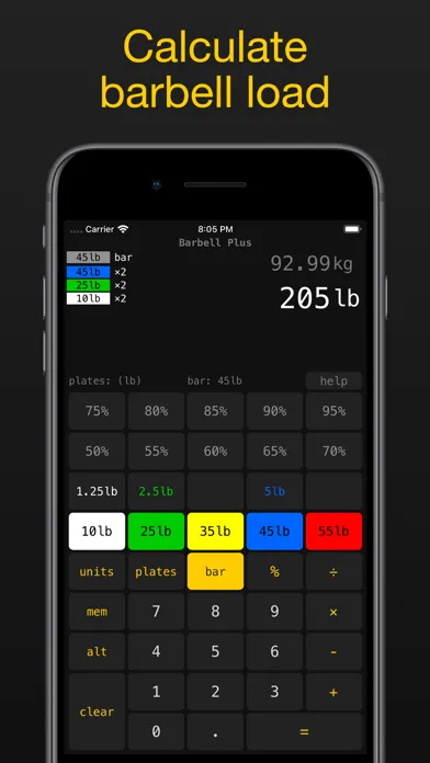 Barbell Plus is a calculator specifically designed to perform barbell weight calculations, percentages, and unit conversions.
