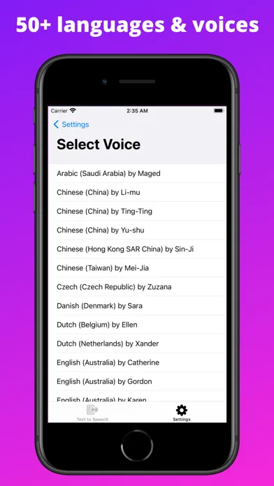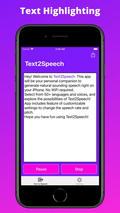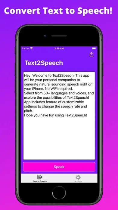 Welcome to Text2Speech! This app will be your personal companion to generate natural sounding speech right on your iPhone and iPad. Select from 50+ languages and voices, and explore the possibilities of Text2Speech!