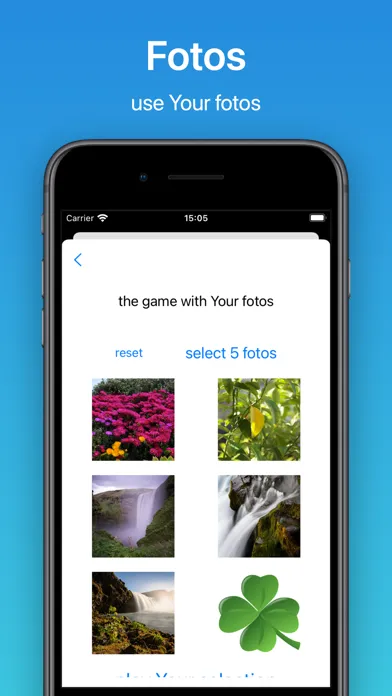 Play with the standard pictures, use nice galleries or select images from the foto app. Your pictures are stored only on Your device.