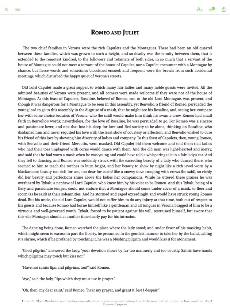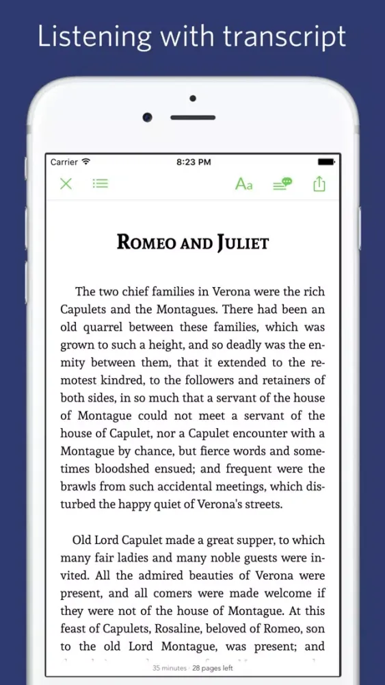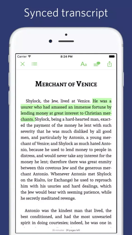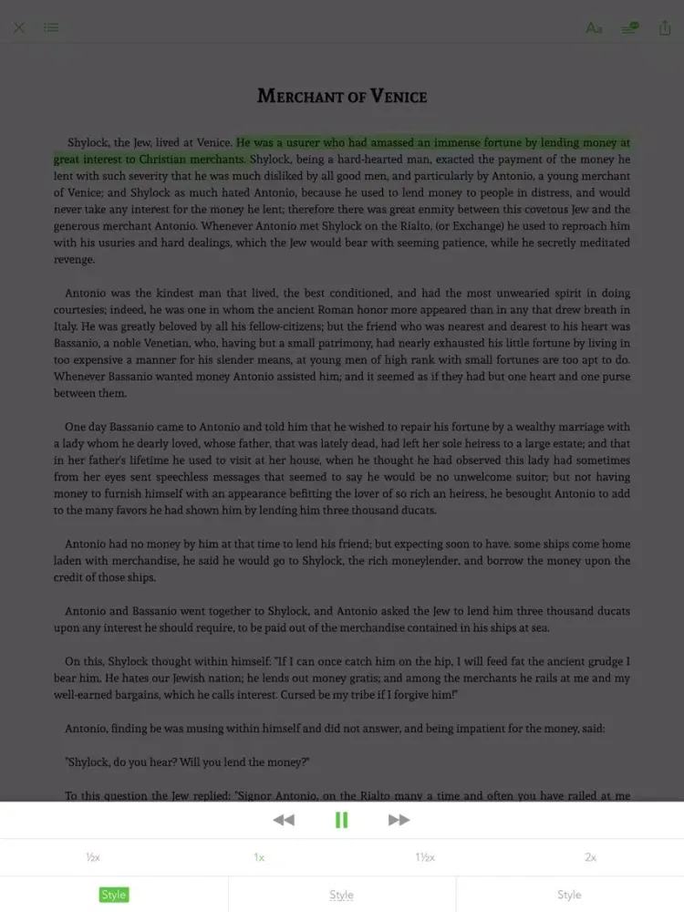 This app combines "Tales from Shakespeare" with professional narration enabling advanced functions like sync transcript, read aloud (a professional narration synchronized with the highlighted text.)
