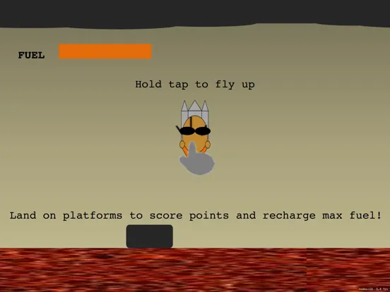 The rocket man is in a dire situation. He is stuck in the volcano with a hot lava running below him. Fortunately, he has a rocket which can make him fly above the lava and also platforms which occasionally show up to his rescue!