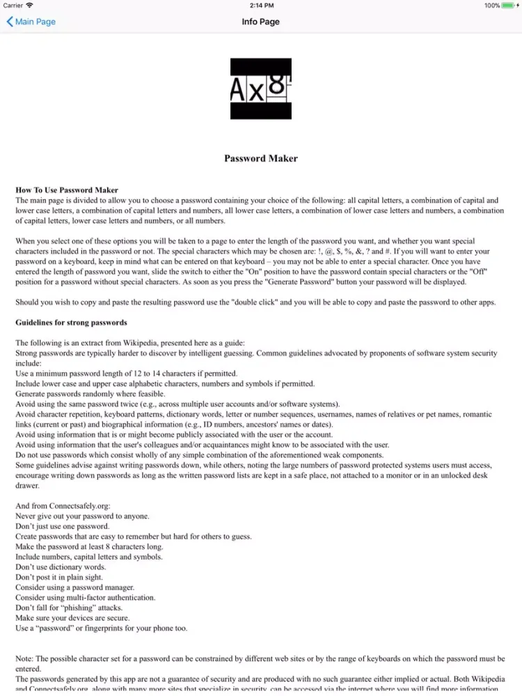 Password Maker will generate a password for you that will be made up of capital or lower case letters, numbers, and special characters, or any combination of these. The resulting password can be copied to another app. You decide how long a password you want and what it will be made up of. What could be easier.