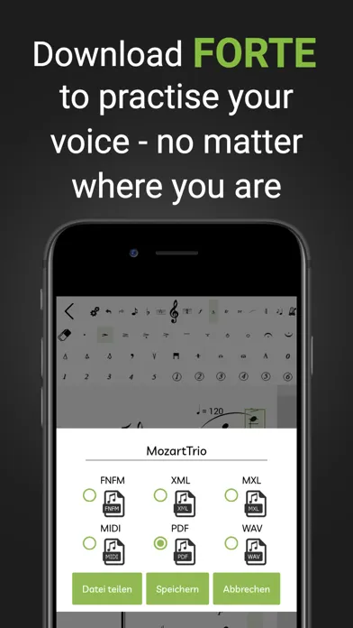 With FORTE READER you can easily open and play sheet music. For more advanced users, FORTE EDITOR provides everything you need to create, write and export scores from your iPhone or iPad. FORTE EDITOR makes it easy to save, share and open scores. FORTE works with most major formats including MIDI, WAV, PDF, MusicXML, and FORTE format.