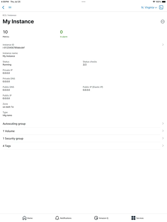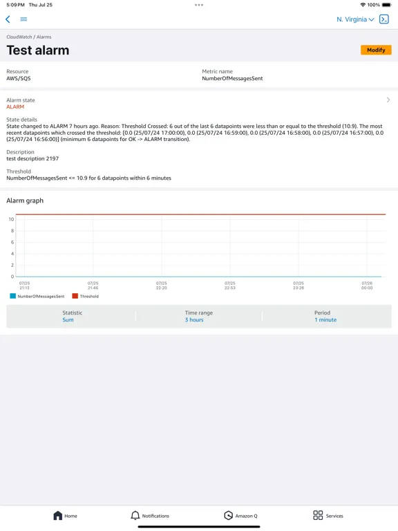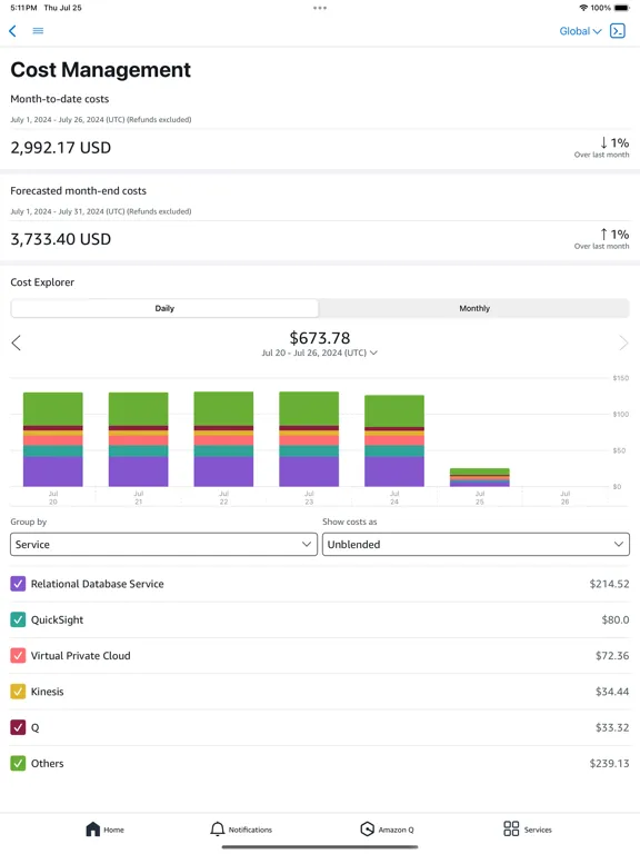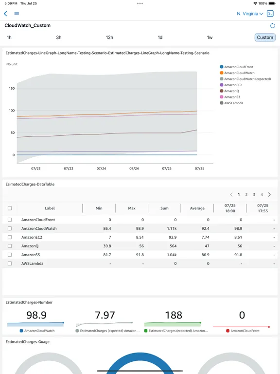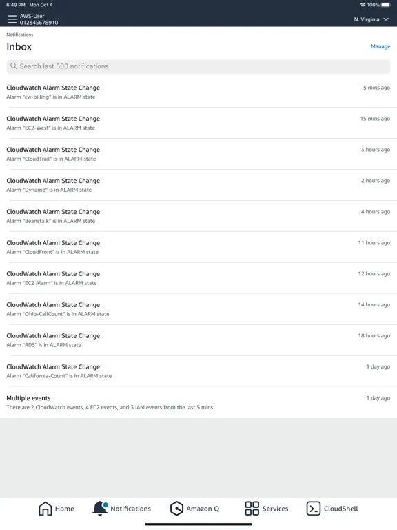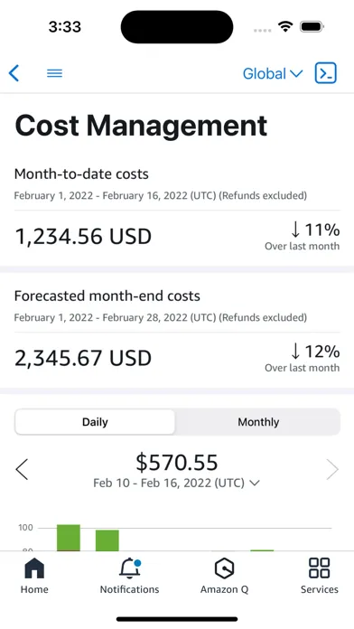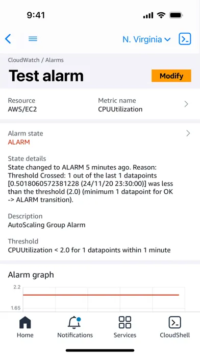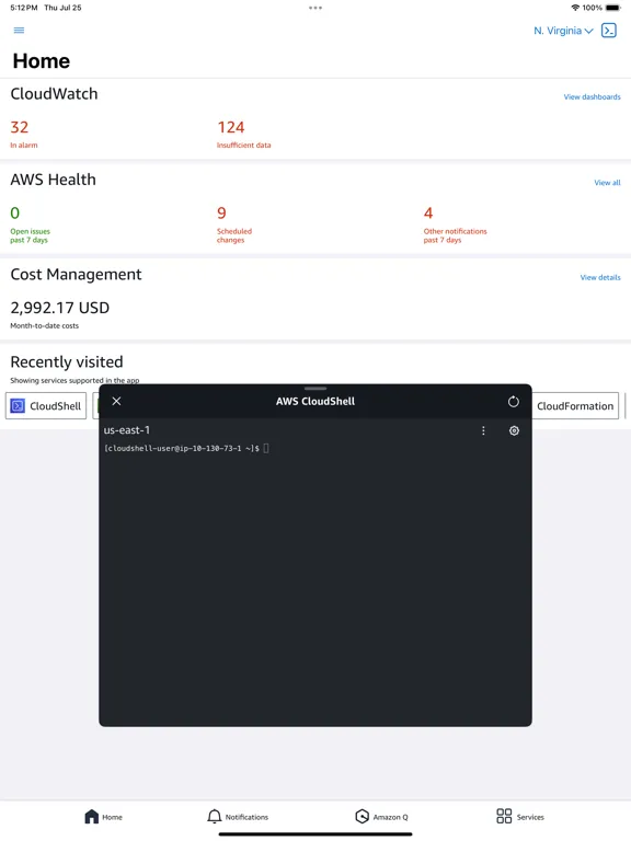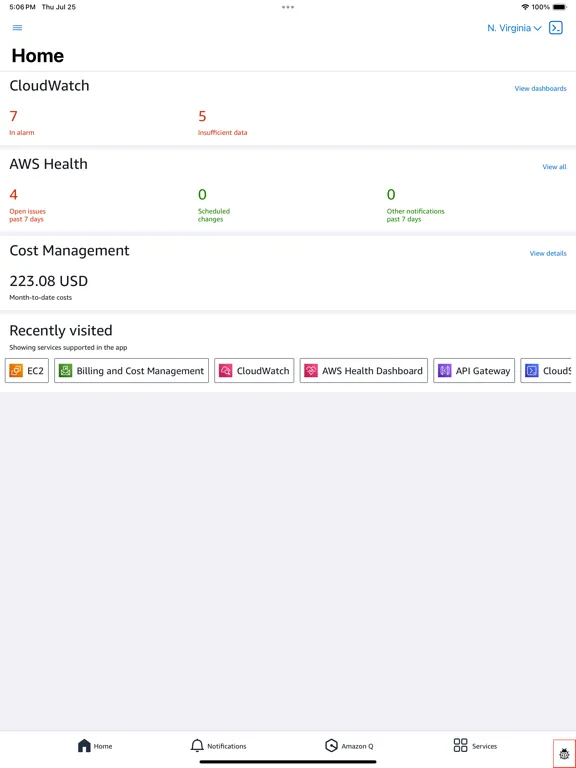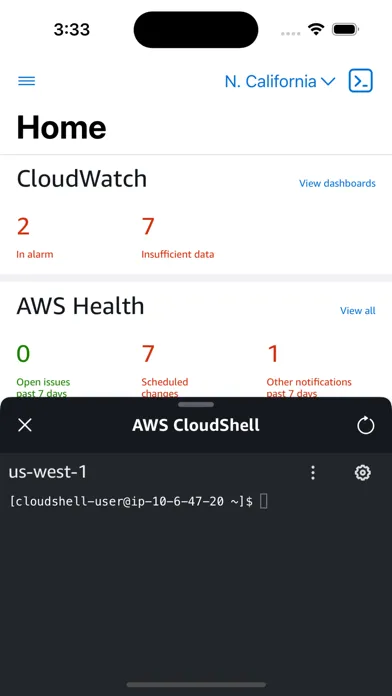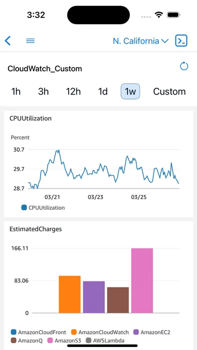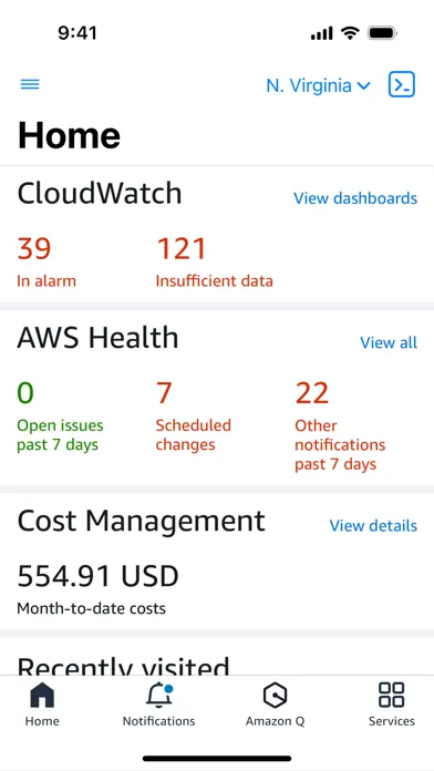 The Console Mobile Application allows you to configure and receive push notifications for AWS services, monitor resources through a dedicated dashboard, and view configuration details, metrics, and alarms for select AWS services. The Dashboard provides permitted users with an overview of the account status, with real-time data on Amazon CloudWatch, AWS Health Dashboard, AWS Billing and Cost Management, and Recently Visited Services. You can view ongoing issues and follow through to the relevant CloudWatch alarm screen for a detailed view with graphs and configuration options. In addition,you can check on the status of specific AWS services, view detailed resource screens, and perform select actions.
