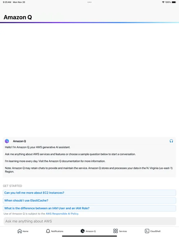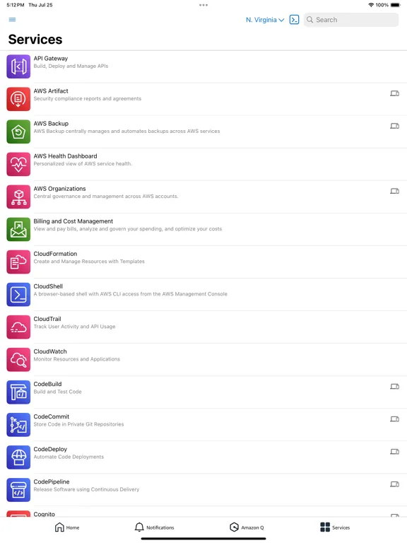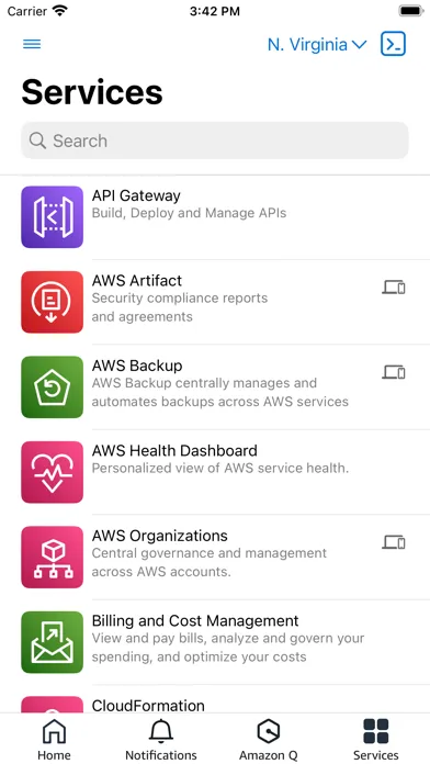 The Console Mobile Application supports Amazon API Gateway, AWS Artifact, AWS Backup, AWS Health Dashboard, AWS Organizations, Billing and Cost Management, AWS CloudFormation, AWS CloudShell, AWS CloudTrail, Amazon CloudWatch, CodeBuild, Code Commit, Code Deploy, Code Pipeline, Cognito, Control Tower, Amazon DynamoDB, AWS Elastic Beanstalk, Amazon Elastic Compute Cloud (Amazon EC2), EMR, Amazon Elastic Container Service (Amazon ECS), Elastic Kubernetes Service, AWS Identity and Access Management, IAM Identity Center, IoT Core, AWS Lambda, Amazon Relational Database Service (Amazon RDS), Amazon Route 53, Amazon Simple Storage Service (Amazon S3), Secrets Manager, Security Hub, Amazon Simple Queue Service(SQS), Step Functions, Systems Manager, Amazon Virtual Private Cloud (Amazon VPC).