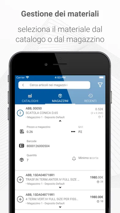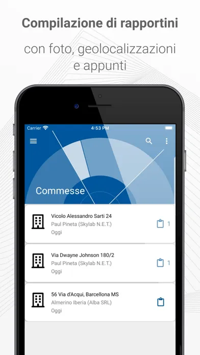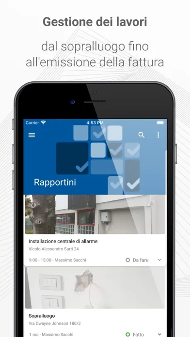 Compilazione di rapportini di lavoro con inserimento di numerosi dettagli tra cui fotografie descrittive, geolocalizzazioni, appunti ed allegati, che resteranno allegati alla documentazione della commessa