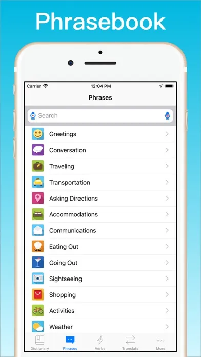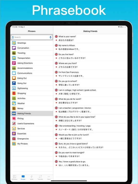 • Phrasebook with 20 categories such as Conversation, Asking Directions and Making Friends.