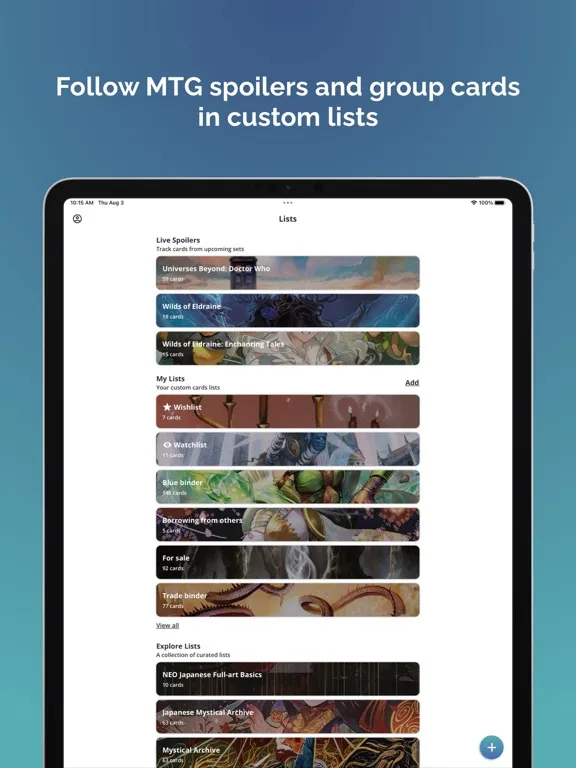 • Add cards by scanning with your device's camera, manually searching, or importing from a text file