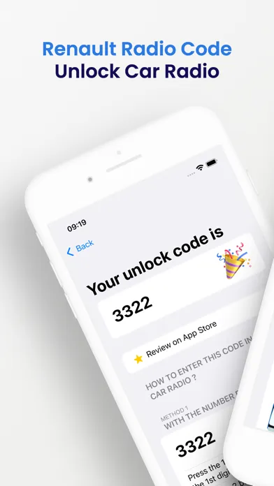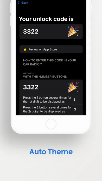 3. Unlock code will be appear in the result screen, and instructions to write code to your car radio.