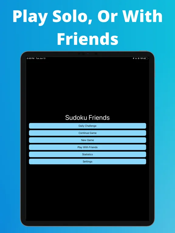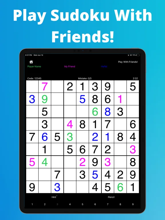 Sudoku Friends allows you to play the classic Sudoku game solo, or cooperatively with your friends to complete the board together! To play with friends click the Play With Friends button on the home screen, input your username, create a new game code and share it with your friends, or enter an existing code to join a game. Once connected you and your friends will work together to complete the game.