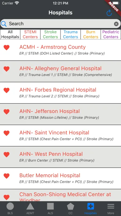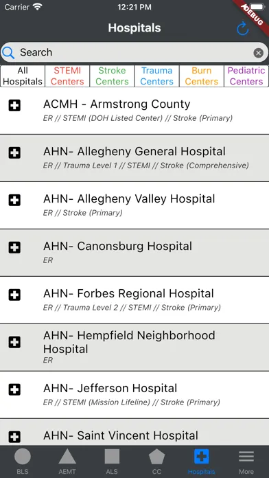While every effort was made to ensure that the data contained is accurate and up-to-date, providers should be mindful to verify they are always operating in accordance with protocols published by the Commonwealth, regional guidance, and the providers respective scope of practice and certification levels. This app also features categorizing and filtering resources by whether or not they were a designated STEMI, stroke, trauma, burn, or pediatric center. Any corrections should be sent in to support immediately.
