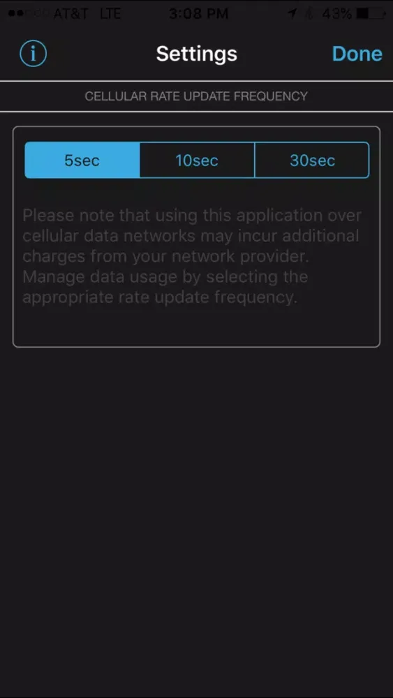 When on Wifi, rates will be updated automatically every second. The update frequency for when on a cellular network is customizable by the user. Available intervals are 5 sec, 10 sec, or 30 sec updates.