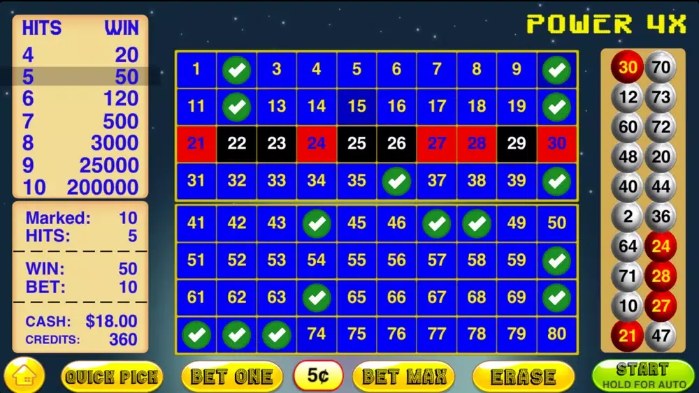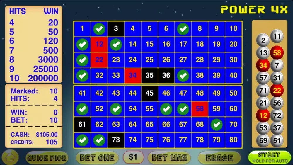 Keno Power Free 4X MULTIPLIER - First Ball HIT in a winning game, gets 4 times the payout!