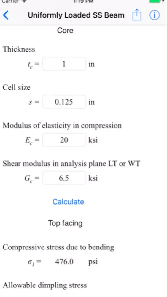 This app presents analysis of honeycomb sandwich panels. Honeycomb consists of an array of cells, formed from very thin sheets of material attached to each other. Usually the cells form hexagons, but there are other cell configurations.