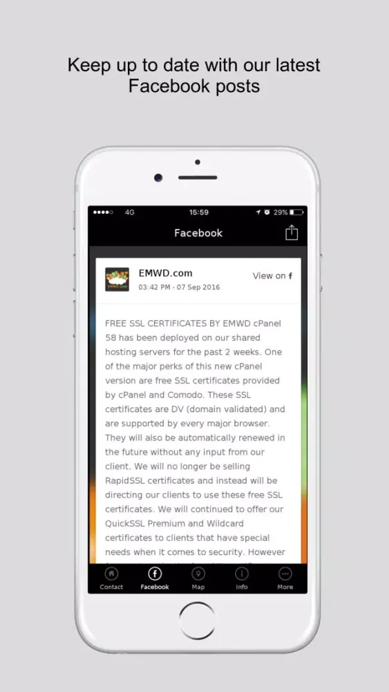 Our app allows our hosting clients to easily access our contact information and any current offers we may be having. It is also a great tool to share our hosting offers with your friends, business colleagues, and family. You can easily stay up to date with the latest EMWD news with our push notifications.